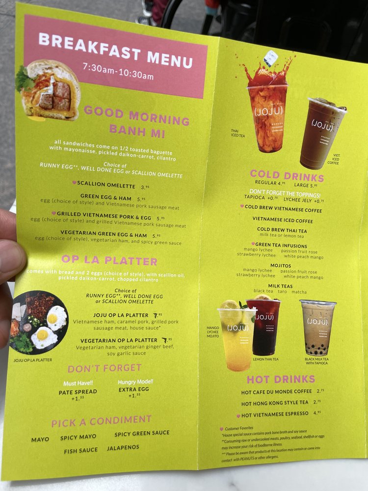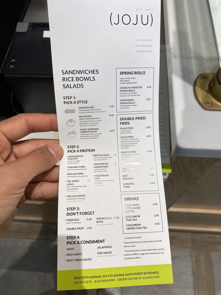 Located on 555 5th Ave, JoJu New York is a vibrant spot dedicated to authentic Vietnamese sandwiches. The menu shines with its signature Banh Mi, featuring protein options like lemongrass chicken and bulgogi, both impressively loaded with flavor. For a delightful kick, don’t miss the Fries Spring Rolls, a unique twist on traditional rolls, topped with spicy mayo and house sauces that perfectly balance heat and tang.